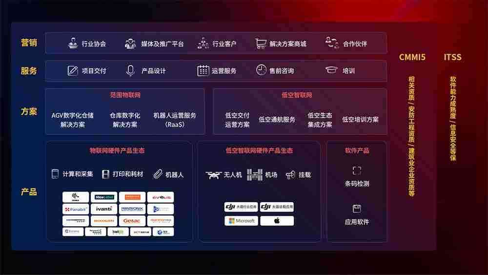 聚合国内外先进的物联网硬件产品品牌,,,,聚焦数字化仓储、、机器人运营、、、低空智联网等领域,,,,共同打造适合客户业务场景的解决方案并提供交付服务