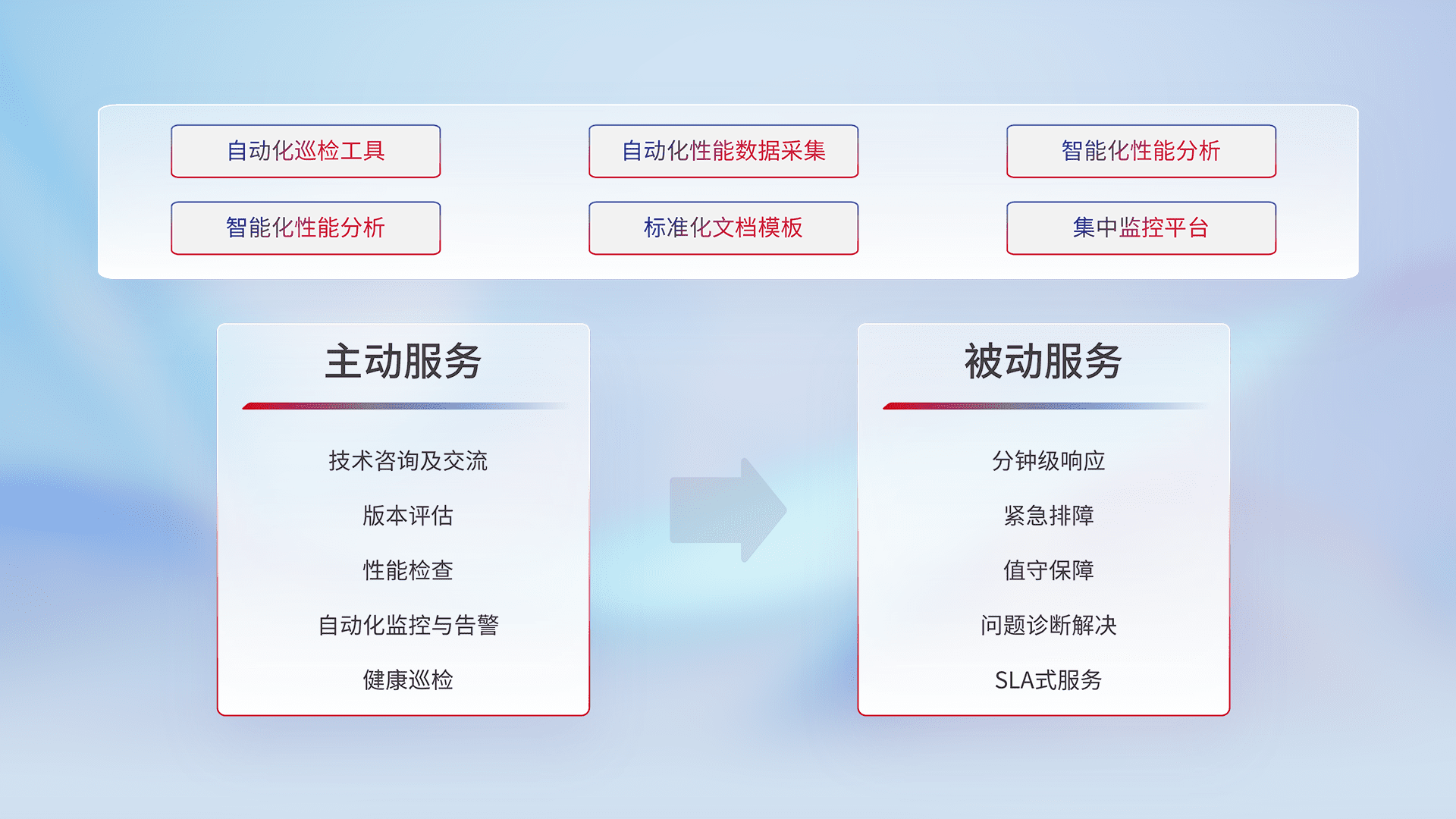 智能化工具和标准化文档,,,保障服务质量,,,,提供主动服务(包含技术咨询、、、版本评估、、性能检查、、、自动化监控与告警、、、健康巡检)和被动服务包含(分钟级响应、、、紧急排障、、、值守保障、、、问题诊断解决、、、、SLA服务)。。